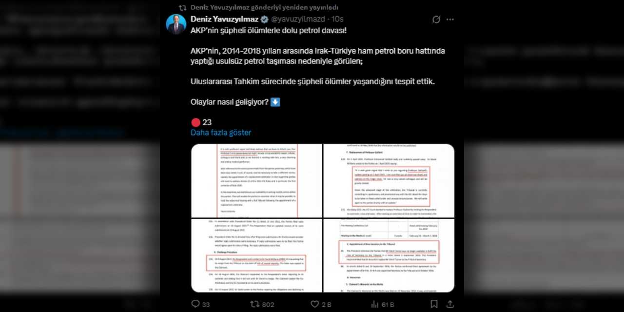 Irak-Türkiye ham petrol boru çizgisi, yapılan yöntemsiz nakliyat nedeniyle Memleketler arası Tahkim’e görütülmüş Türkiye 1 milyar 471 milyon dolar cezaya çarptırılmıştı. CHP Genel Lider Yardımcısı Deniz Yavuzyılmaz, o cezanın ABD’de görülen tenfiz davasında Türkiye’nin AKP öncesi devrinden kalan Irak’tan alacaklarına saydırılmaya çalışıldığı iddasını gündeme getirmişti.