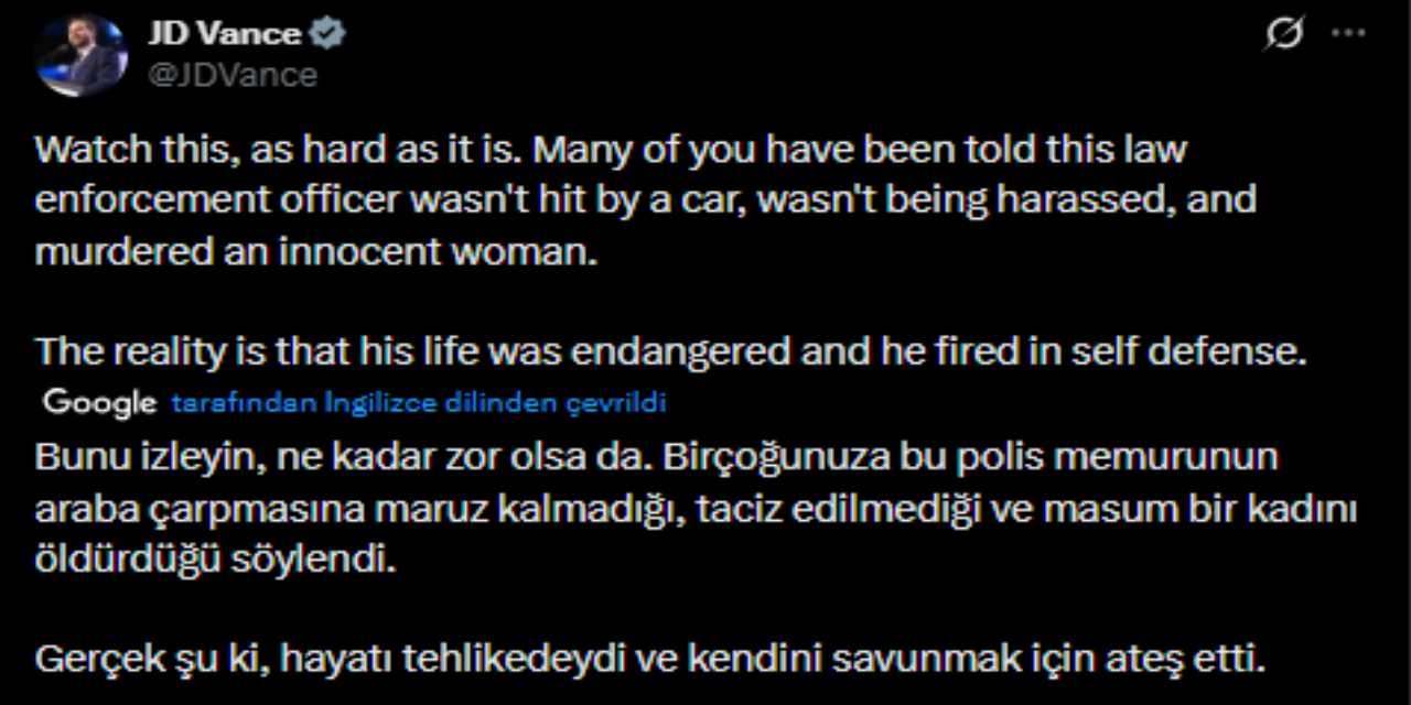 Vance o görüntüye “Birçoğunuza bu polis memurunun günahsız bir bayanı öldürdüğü söylendi. Gerçek şu ki, hayatı tehlikedeydi ve kendini savunmak için ateş etti” notu düştü.