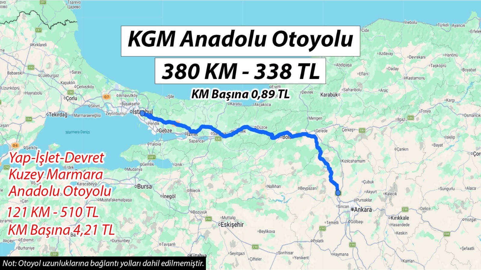 Yapılan karşılaştırmaya nazaran, kamunun işlettiği bu otoyolda geçiş fiyatı kilometre başına 0,89 TL iken, tıpkı güzergahta bulunan ve Yap-İşlet-Devret modeliyle inşa edilen Kuzey Marmara Otoyolu’nda bu fiyatın 4,21 TL olduğu tabir edildi. Bu, ortadaki farkın dört kata ulaştığını gösteriyor.