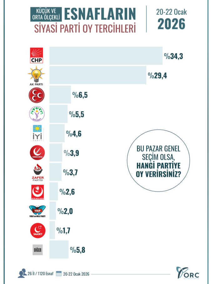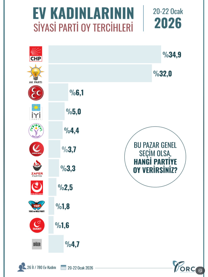 ORC Araştırma’nın, 20-22 Ocak 2026’da esnaf ile yaptığı anket çalışmasının sonucu. RRC’nin X paylaşımı (26 Ocak 2026)EV BAYANLARI HANGİ SİYASİ PARTİYİ TERCİH EDİYOR?