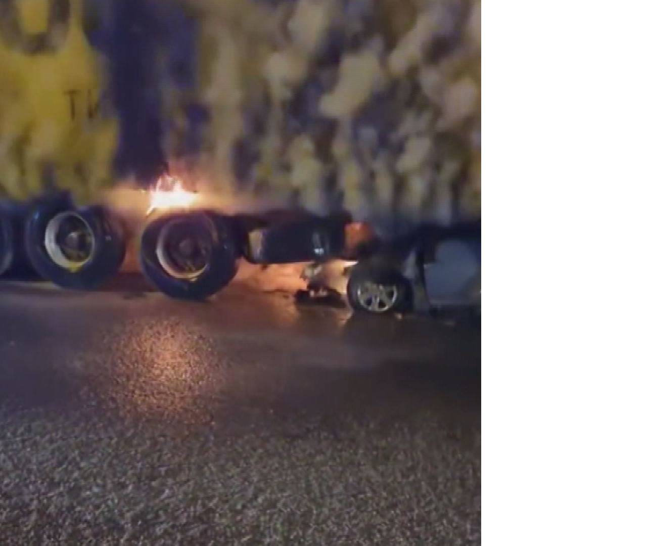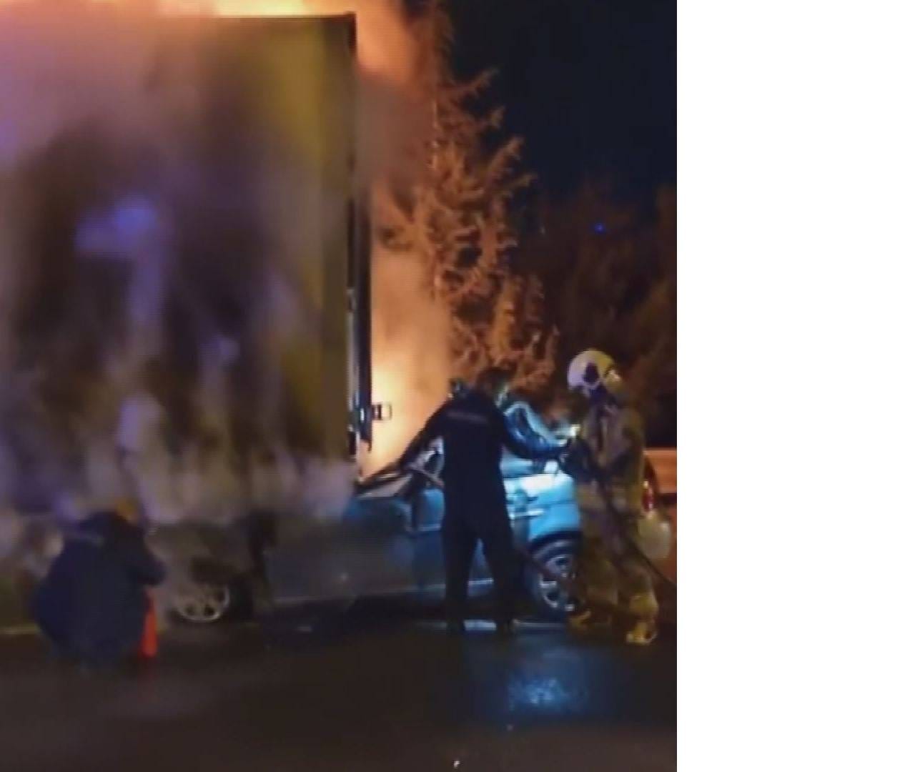 Çarpışmanın şiddetiyle araba, TOR’ın dorsesinin altına girdi. Dorsenin altına sıkışan araç, kısa müddette alev alarak yanmaya başladı.
