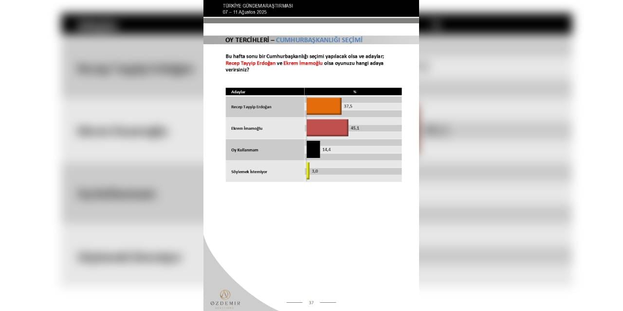 Özdemir Araştırma’nın 7-11 Ağustos 2025 tarihleri ortasında 31 vilayet, 26 bölgede yaptığı Türkiye Gündem Araştırması’nda, muhtemel bir Cumhurbaşkanlığı seçiminde Recep Tayyip Erdoğan ile Ekrem İmamoğlu’nun müsabakası durumunda seçmen tercihleri ölçüldü.