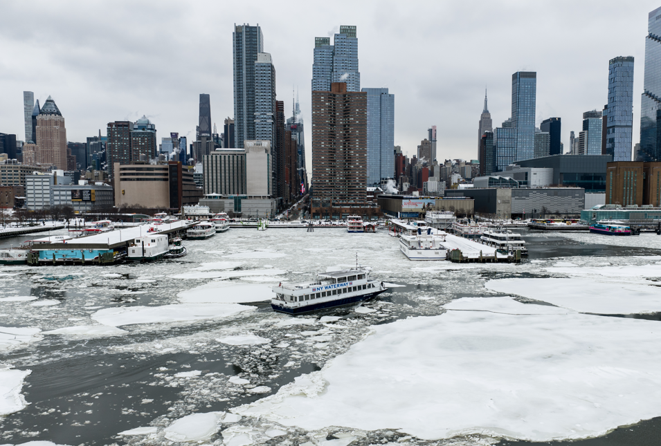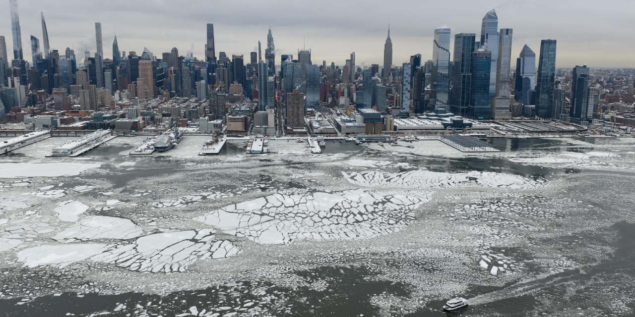 Kar fırtınası ve “tarihi” olarak bedellendirilen soğuk hava sebebiyle, New York’ta bulunan Hudson Nehri’nin kimi kısımları dondu. Irmağın üzerinde buz kütleleri oluşurken tekne ve gemiler ilerlemekte zorluk yaşadı.