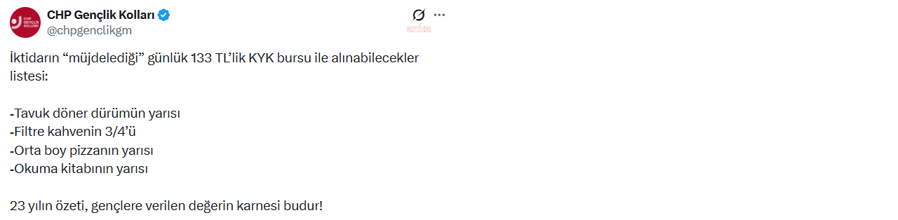Listenin yanı sıra CHP Gençlik Kolları paylaşımında, “23 yılın özeti, gençlere verilen kıymetin karnesi budur” notunu düştü.