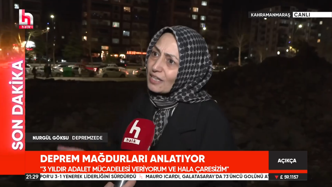 Depremlerin üçüncü yıl dönümünde Ezgi Apartmanı’nın üzerinde Halk TV’den Sahra Atilla’ya konuşan Nurgül Göksu, adalet daveti yaptı.