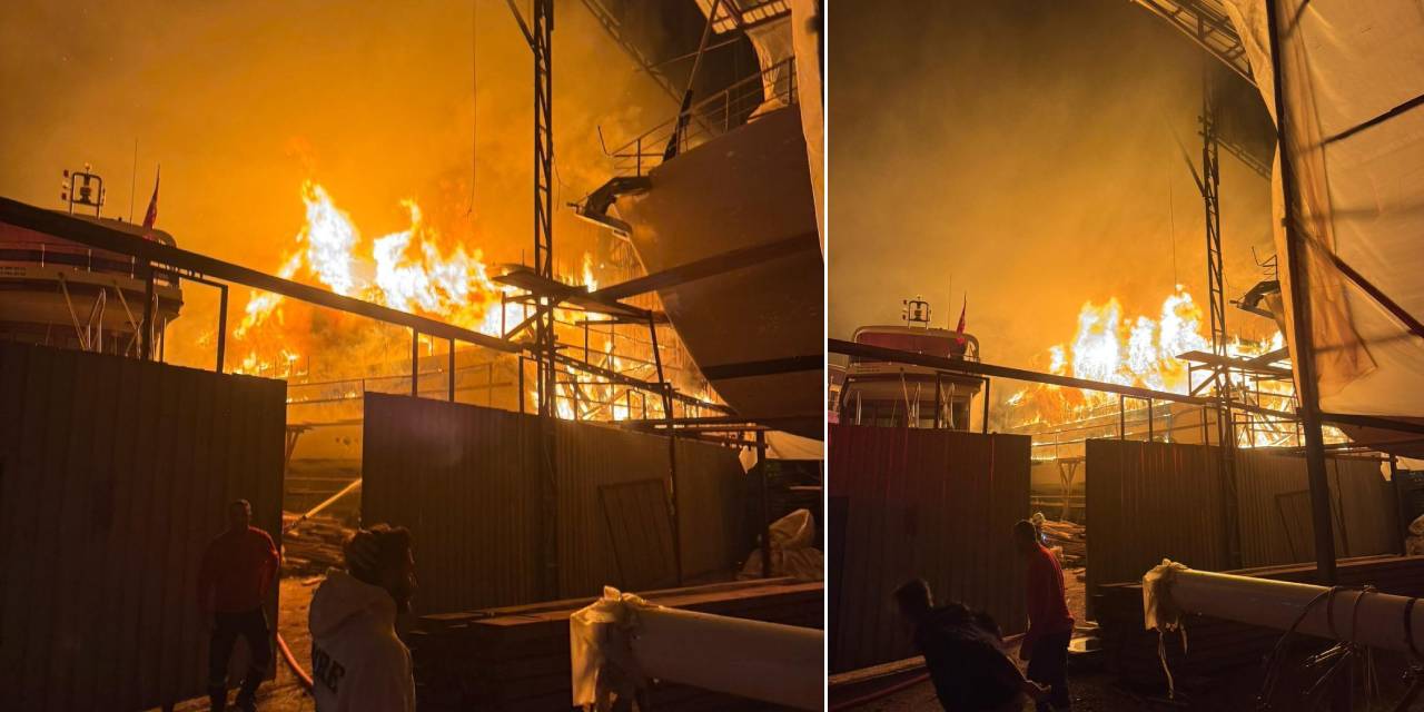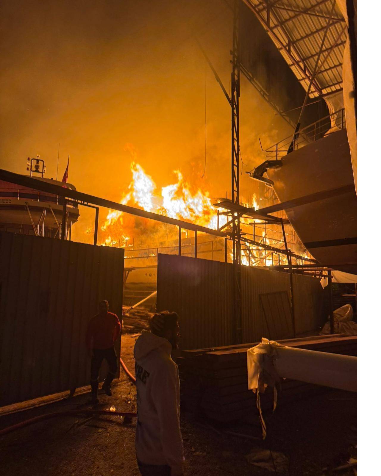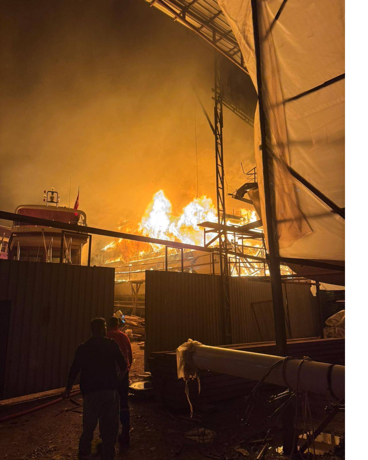 Yangın, gece yarısı Karagözler Mahallesi’nde bulunan tersanedeki gulet teknede meydana geldi.