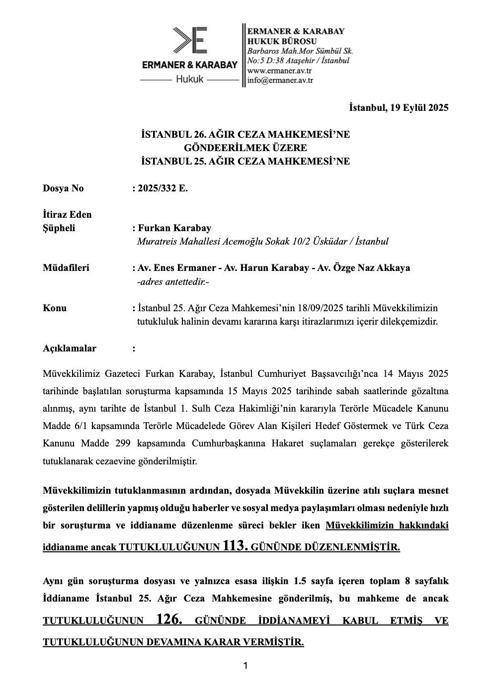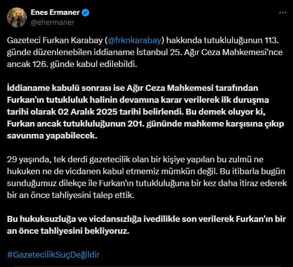“Gazeteci Furkan Karabay hakkında tutukluluğunun 113. günde düzenlenebilen iddianame İstanbul 25. Ağır Ceza Mahkemesi’nce fakat 126. günde kabul edilebildi.