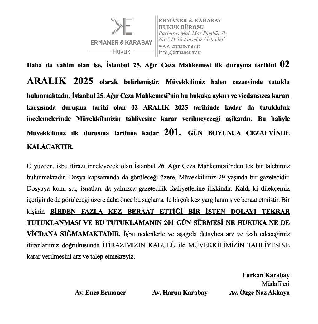 29 yaşında, tek kederi gazetecilik olan bir bireye yapılan bu zulmü ne hukuken ne de vicdanen kabul etmemiz mümkün değil. Bu prestijle bugün sunduğumuz dilekçe ile Furkan’ın tutukluluğuna bir defa daha itiraz ederek bir an evvel tahliyesini talep ettik.