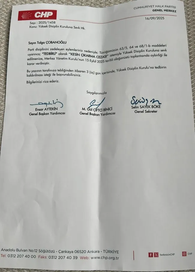 İhraç talebine gerekçe olarak Çobanoğlu, parti disiplinini zedeleyen aksiyonları gösterildi.