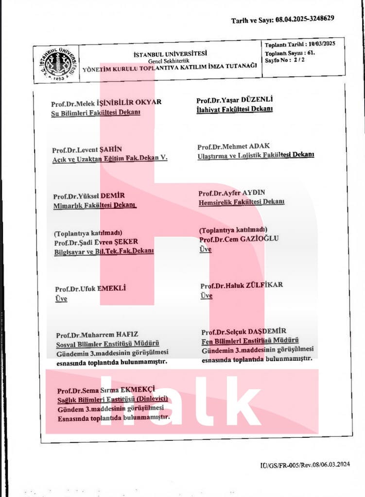 18 Mart 2025 tarihli ve 61 sayılı toplantıya ilişkin tutanaklarda, bilhassa diplomanın iptalinin görüşüldüğü 3’üncü gündem hususu sırasındaki iştirakçi durumu dikkat çekti.