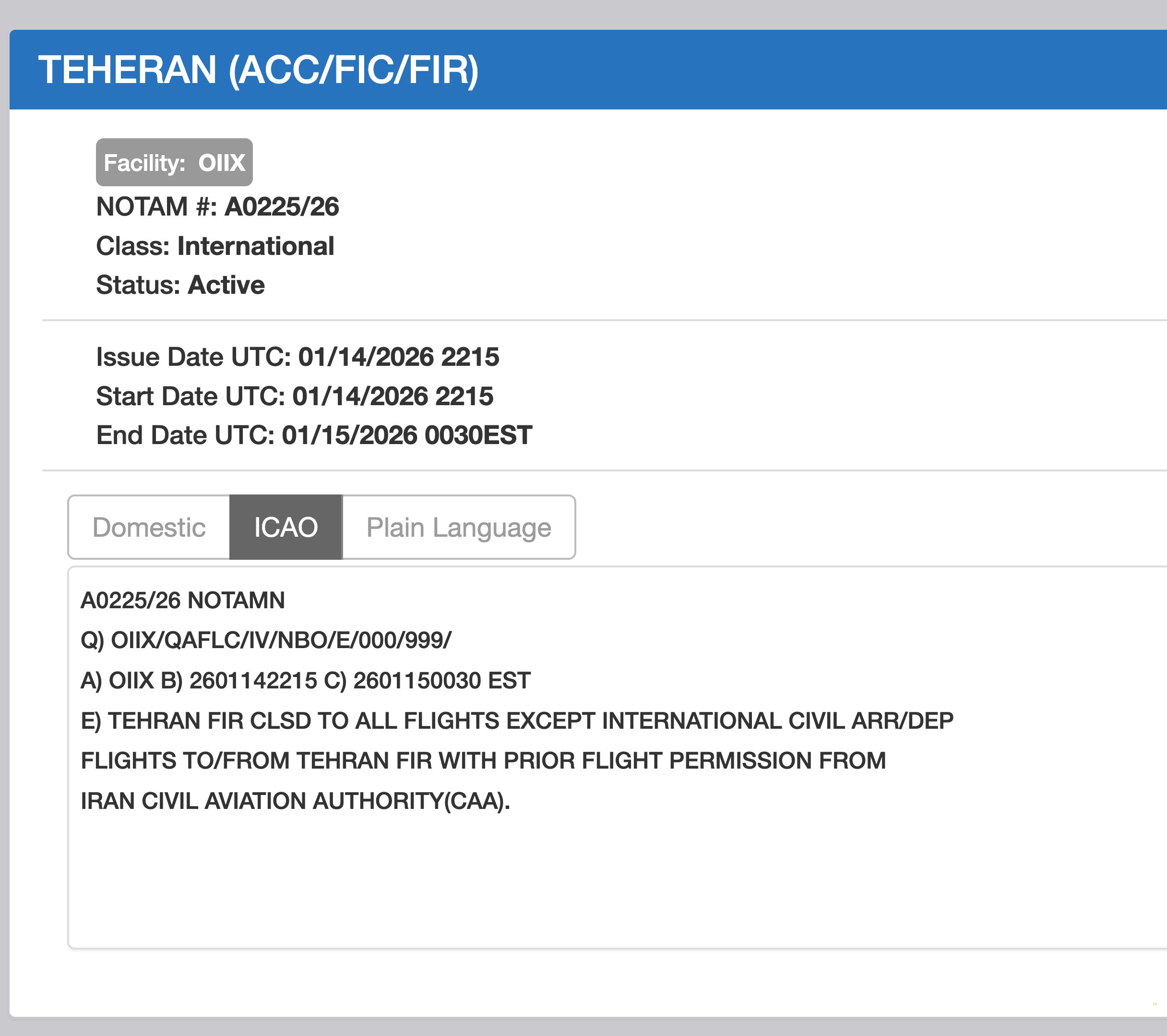 NOTAM yayınlanmadan kısa bir süre önce, ABD Başkanı Trump bir basın toplantısı düzenledi ve İran’daki cinayetlerin durdurulduğunu kendisine bildirildiğini söyledi.