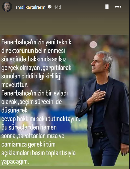 Kartal hakkındaki tezler ile ilgili bir basın toplantısı düzenleyeceğini duyurdu. Kartal açıklamasında “Fenerbahçe’mizin yeni teknik yöneticisinin belirlenmesi sürecinde hakkımda temelsiz gerçek olmayan, çarpıtılarak sunulan önemli bilgi kirliliği mevcuttur. Karşılık hakkımı gizli tuttum. Bu süreçlerden çabucak sonra taraftarlarımıza ve topluluğumuza gerekli tüm açıklamaları basın toplantısıyla yapacağım” kelamlarını sarf etti.