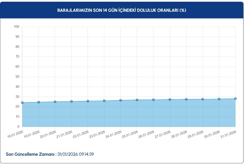 İSKİ bilgilerine nazaran, 29 Ocak’ta yüzde 27,63 düzeyinde bulunan baraj doluluk oranı, 30 Ocak prestijiyle yüzde 27,8’e yükseldi. Artış eğilimi bugün de devam ederken, 31 Ocak prestijiyle doluluk oranı yüzde 28,24 olarak ölçüldü.