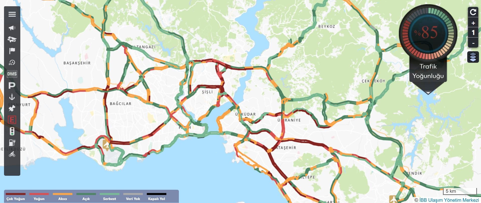 İstanbul Büyükşehir Belediyesi (İBB) CepTrafik datalarına nazaran, kentteki genel trafik yoğunluğu yüzde 85 bandını aştı.