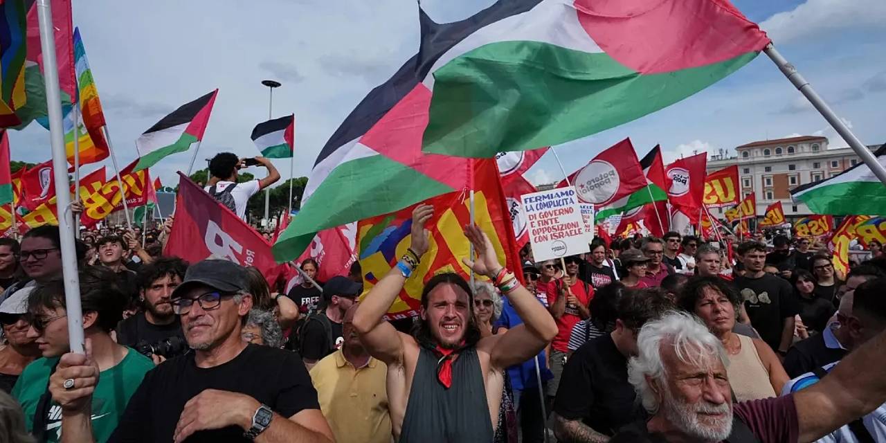 Roma’da on binlerce kişi, kentin merkez garı Termini önünde toplandı. Ellerinde Filistin bayrakları taşıyan göstericiler sık sık “Filistin’e özgürlük”, “Hepimiz antisiyonistiz”, “Nehirden denize özgür Filistin”, “Katil Netanyahu”, “İntifada”, “Özgür Gazze” ve “Siyonist terörist devlet İsrail” sloganları attı.