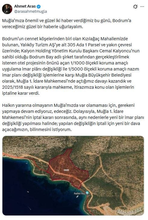 Bodrum’un cennet köşelerinden biri olan Kızılağaç Mahallemizde bulunan, Yalıköy Turizm AŞ’ye ilişkin 305 Ada 1 Parsel ve yakın etrafı üzerinde; Kalyon Holding Yönetim Kurulu Lideri Cemal Kalyoncu’nun sahibi olduğu Bodrum Bay isimli şirket tarafından gerçekleştirilmek istenen otel projesinin önünü açan 1/1000 ölçekli müdafaa maksatlı uygulama imar plânı değişikliği ile 1/5000 ölçekli müdafaa maksatlı nazım imar planı değişikliği süreçlerine karşı Muğla Büyükşehir Belediyesi olarak, Muğla 1. Yönetim Mahkemesi’nde açtığımız davayı kazandık ve 2025/1518 sayılı kararıyla mahkeme, itirazımıza bahis olan süreçlerin iptaline karar verdi.
