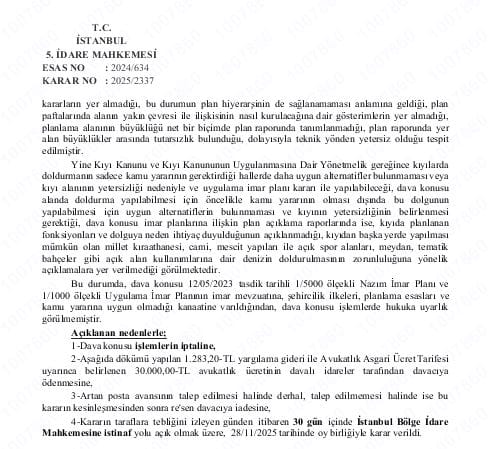 1/5000 ölçekli Nazım İmar Planı ve 1/1000 ölçekli Uygulama İmar Planının imar mevzuatına, şehircilik prensipleri, planlama temelleri ve kamu faydasına uygun olmadığı kanaatine varıldığından, dava konusu süreçlerde hukuka uyarlık görülmemiştir” sözleri yer aldı.