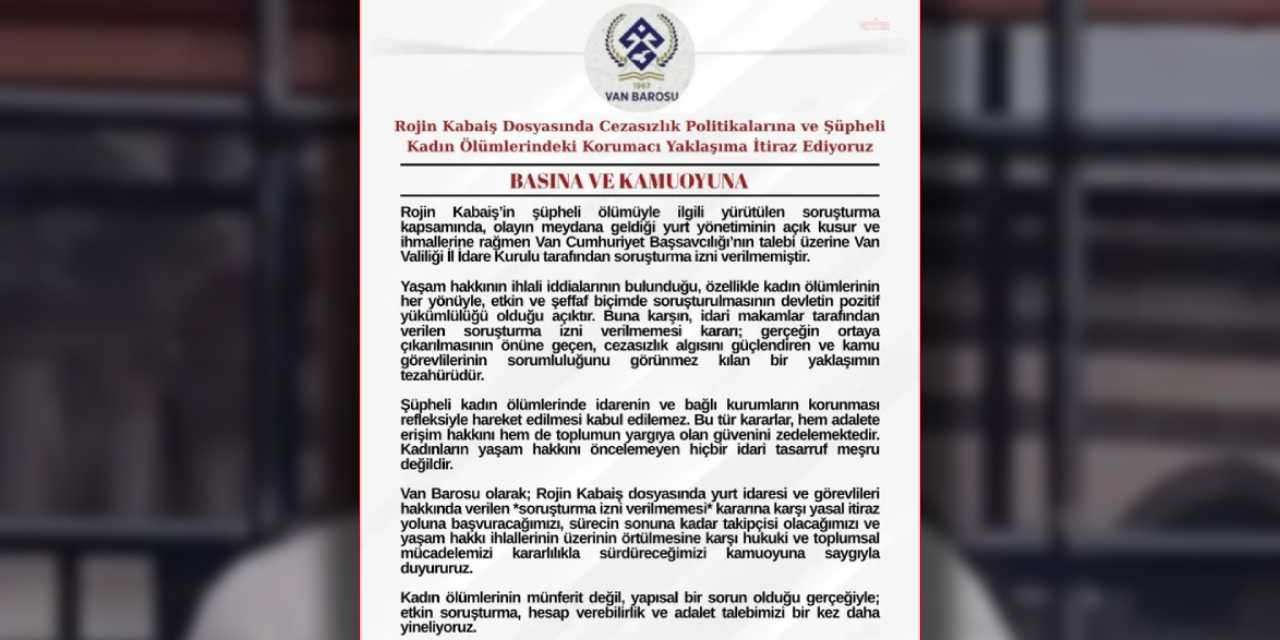 Van Barosu’ndan yapılan yazılı açıklamada “Rojin Kabaiş’in kuşkulu vefatıyla ilgili yürütülen soruşturma kapsamında, olayın meydana geldiği yurt idaresinin açık kusur ve ihmallerine karşın Van Cumhuriyet Başsavcılığı’nın talebi üzerine Van Valiliği İl İdare Kurulu tarafından soruşturma müsaadesi verilmemiştir” denildi.