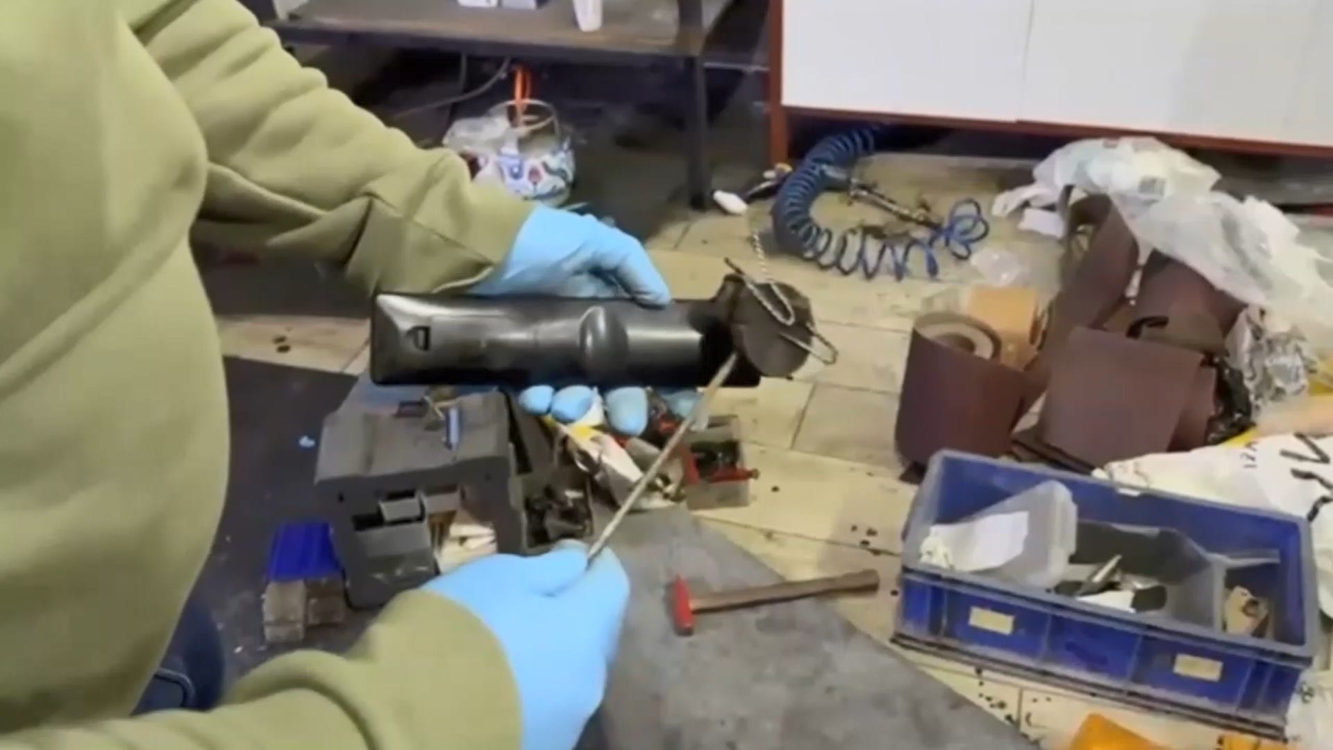 Polis takımları tarafından yapılan aramalarda ise, televizyon kumandasının içine bir düzenek kurularak ruhsatsız silahların bâtın bölmelere saklandığı tespit edildi. Düzeneği çözen gruplar, bu bölmede 7 ruhsatsız tabanca, 6 tabanca gövdesi, 13 namlu, 4 sürgü grubu, 10 namlulu üst kapak, 4 boş şarjör, 85 fişek ile çok sayıda silah parçası ele geçirdi.