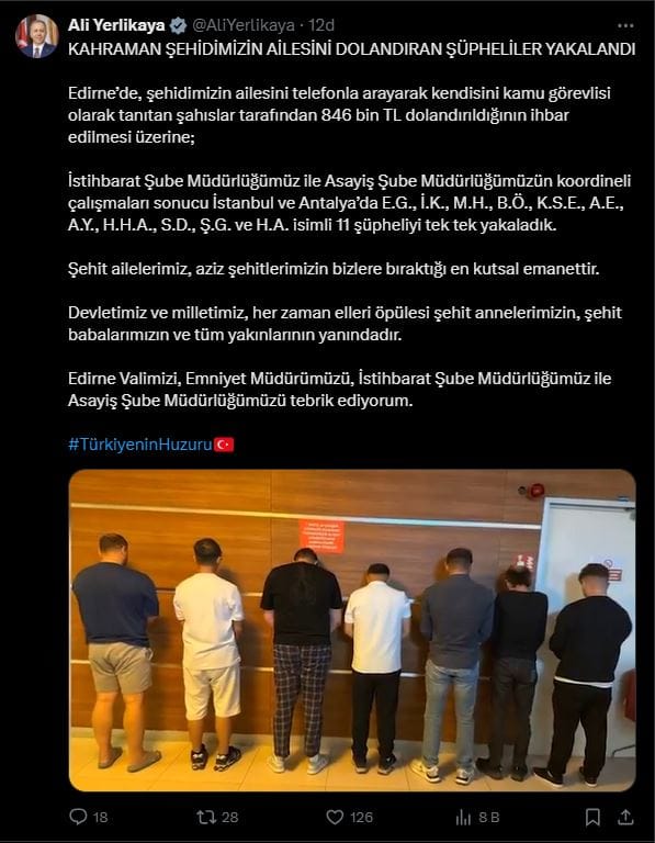 Edirne’de, şehidimizin ailesini telefonla arayarak kendisini kamu vazifelisi olarak tanıtan şahıslar tarafından 846 bin TL dolandırıldığının ihbar edilmesi üzerine;