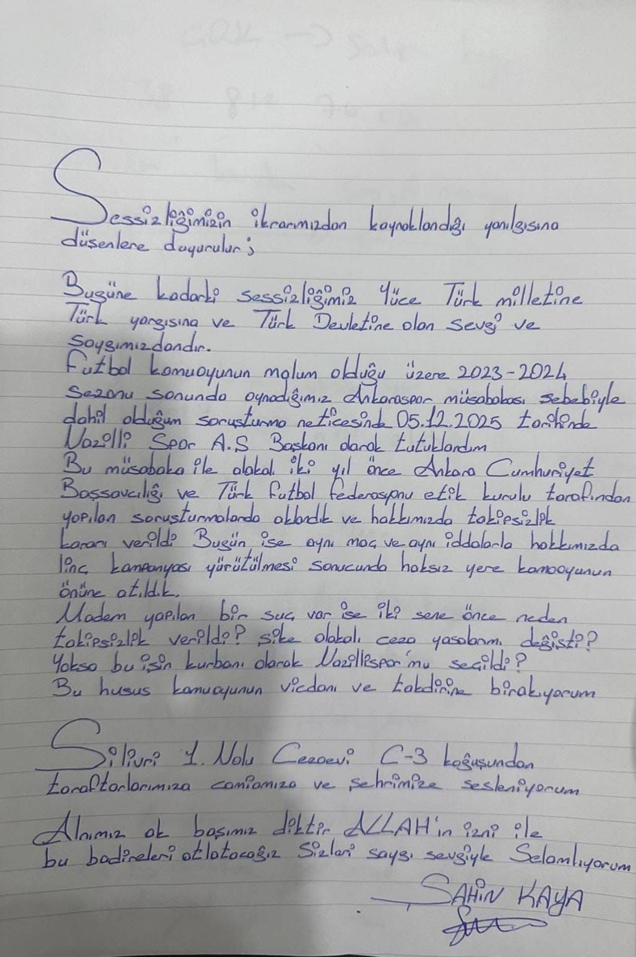 TFF 3. Lig 4. Küme’de son sırada yer alan Nazilli Spor’da “Futbolda bahis” soruşturmasında gözaltına alındıktan sonra şike yaptığı gerekçesiyle tutuklanan Lider Şahin Kaya, Silivri Cezaevi’nden mektup yazdı.