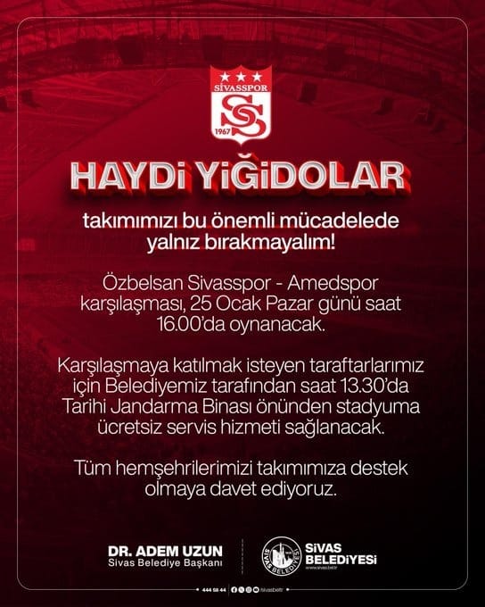 Sivas Belediyesi de maç için harekete geçti. Yapılan açıklamada Sivasspor-Amedspor maçında taraftarlar için fiyatsız otobüsler kaldırılacağı bildirildi.