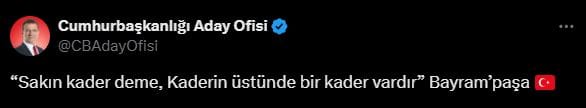 İmamoğlu, tek cümlelik paylaşımında, AKP Genel Başkanı ve Cumhurbaşkanı Recep Tayyip Erdoğan’ın geçmişteki seçim süreçlerinde sıkılıkla kullandığı “Sakın mukadderat deme, Mukadderatın üstünde bir mukadderat vardır” tabirini kullandı.