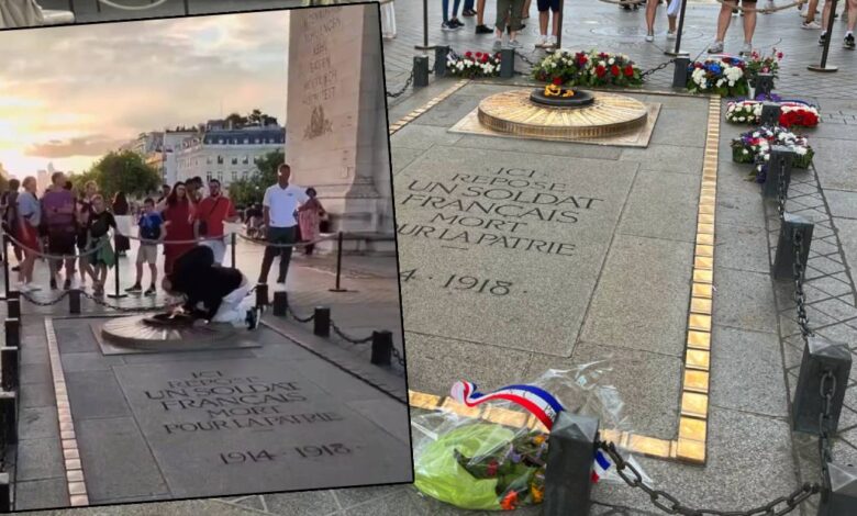 Toplumsal medya üzerinden paylaşılan bir görüntüde kimliği bilinmeyen bir kişinin Fransa'nın başşehri Paris'in değerli simgeleri olan Zafer Takı'nın alt kısmında…