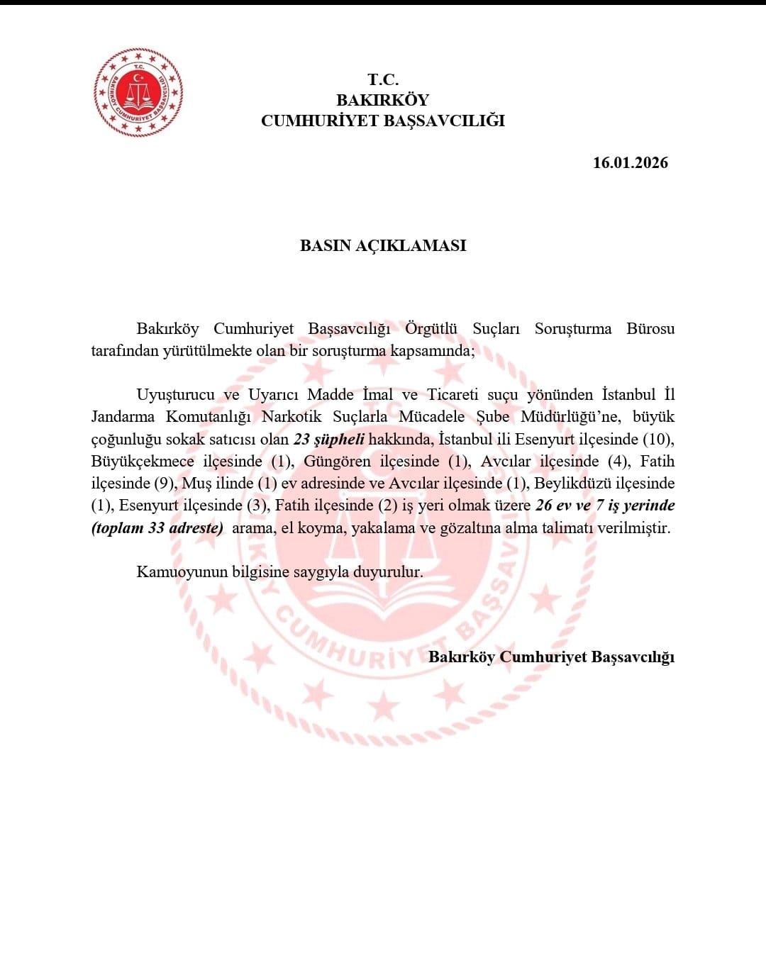 Savcılık talimatı doğrultusunda İstanbul’un Esenyurt (10), Büyükçekmece (1), Güngören (1), Avcılar (4) ve Fatih (9) ilçeleri ile Muş vilayetinde (1) olmak üzere toplam 26 konut adresinde; Avcılar (1), Beylikdüzü (1), Esenyurt (3) ve Fatih (2) ilçelerinde ise 7 iş yerinde arama yapılması kararı verildi. Toplamda 33 adreste eş vakitli süreç uygulanması kararlaştırıldı.